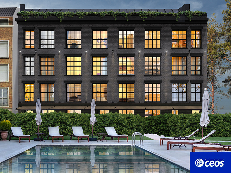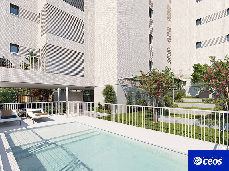 El edificio se organiza en un bloque de siete plantas sobre rasante (Baja + VI + Ático) y tres plantas bajo rasante, albergando un total de 27 viviendas de dos dormitorios, todas ellas con trastero y plaza de garaje. Con una superficie total construida de 5.064,88 m², la intervención optimiza los espacios comunes situados en la planta baja, que incluyen una piscina, áreas ajardinadas, una sala comunitaria versátil y un cuarto de bicicletas.